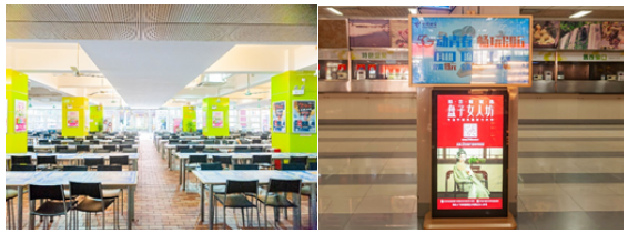 比如大学食堂和宿舍楼就是每个大学生的必经之处,是一个高频的、停留时间较长的空间场景。对于这样的场景,不管是校园框架、桌贴广告,还是LED联播网都是一个不错的选择,它们具有覆盖面积大、触达率高的特点,能够及时在学生群体中进行广泛传播,让品牌精准的在学生群体中建立认知,提高品牌影响力,使学生和品牌的联系更加紧密。